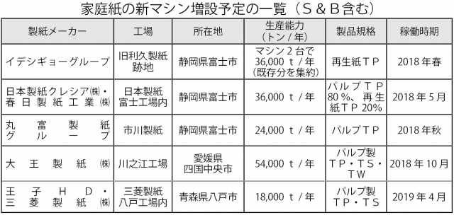 家庭紙の新マシン増設予定の一覧(S&B含む)