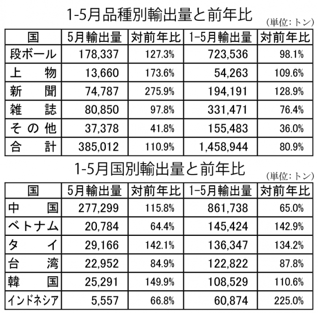 5月の古紙輸出量は38万5,012トンで、対前年比110.9%。1ー5月の累計では145万8,944トンで、対前年同期比80.9%となった。昨年8月から今年3月まで8ヵ月連続で20万トン台の輸出量が続いたが、一転して今年4月~5月は30万トンを超えた。 発生期の3月~5月にかけて、古紙問屋の在庫はかなり膨れ上がった。関東商組32社の古紙在庫量は、3月~5月にかけて対前年比146%~156%を...