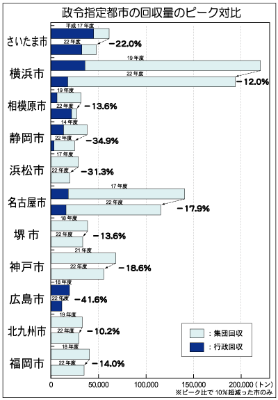 横浜市と静岡市が平成二十五年度中を目処に行政回収(分別収集)を停止し集団回収に完全移行する。両市とも行政回収の回収量はピーク時に比べ三割程度まで減っている。全国の政令指定都市の動向を調べてみても、回収量は平成十七~十九年をピークに減少しているところが多い。古紙価格の低迷とともに全国に拡がった行政回収は、価格が回復した一方で回収量が減り始め、その前提が揺らいでいる。多様な民間回収が拡がるなか、行政回...