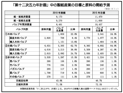 「第十二次五カ年計画」中の製紙産業の目標と原料の需給予測2015年の中国製紙業