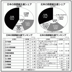 北米(米国とカナダ)の段原紙メーカーの再編が加速している。今年一月、ロックテンがスマーフィット・ストーン・コンテナーの買収を発表した。これに危機感を持ったインターナショナルペーパーは、六月から北米四位のテンプル・インランドの買収工作を開始。3ヶ月に渡る攻防の末、9月に買収合意が発表された。これによってインターナショナルペーパーの段原紙生産は1,367万トン、シェアは37%に拡大した。米国と日本の段...