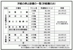 リーマン・ショックと東日本大震災の打撃を受け、洋紙設備の停止ラッシュが加速している。日本製紙グループは、洋紙事業の復興計画の中で大幅な洋紙マシンの稼動停止を明らかにした。洋紙生産能力の15%にあたる年産80万トンの削減で、これに伴いDIP(脱墨古紙パルプ)設備は富士工場と吉永工場の日産計620トンが停止する。 王子製紙の富士工場でも今年4月に日産320トンのDIP設備が停止しており、静岡地区...