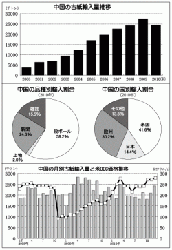 既報のように、昨年の中国の古紙輸入量は製紙産業が発展して初めてのマイナス成長となった。輸入量は2,435万トンで、前年から315万トン減、11.5%の減少。しかし中国の紙・板紙生産量は依然として8%前後の成長を続けており、輸入量の減少以上に国内回収量が大きく増加している。2015年問題の前倒しという見方もあるが、今後の古紙輸入量はまだ増加傾向にあるというのが関係者の見解。昨年の国別・品種別による中...