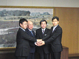 調印式を終えて握手をする(右から)熊本市長の幸山氏、熊本県知事の蒲島氏、㈱エコポート九州取締役会長の平戸氏、㈱エコポート九州代表取締役社長の石坂氏