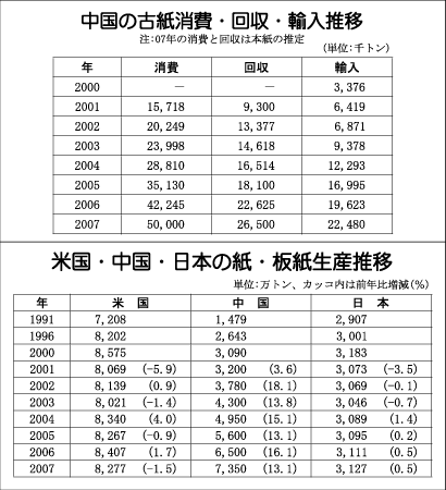 日本紙類輸出入組合調べによると、昨年の中国の紙・板紙生産量は前年比13.1%増の7,350万トンになった。消費が7,290万トン(10.5%増)で、生産が消費を上回ったのは初めて。生産が消費を上回ったということは中国は紙・板紙の輸出国に転じたということになる。生産の二桁成長は2002年から続いており、これで6年連続となった。 ただ今年1-3月の中国の古紙輸入(3面に掲載)にみられるように、2...