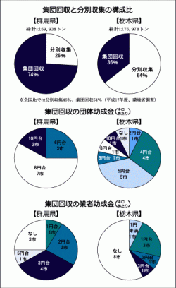 全国の地方自治体の都市部を対象とした集団回収と分別収集の調査で、今回は栃木県と群馬県を報告する。栃木県の14市で人口は164万人、群馬県の12市で165万人である。人口規模はほぼ同じだが、回収量は栃木県の7万6,000トンに対して群馬県は6万トンで、栃木県が1万6,000トン上回る。 また集団回収と分別収集の構成比は栃木県が36:64、群馬県が74:26で対照的だ。栃木県では2本立て回収が奏...