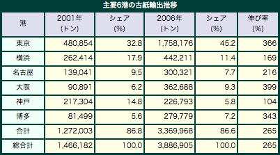 過去6年間の主要6港における古紙の輸出動向を調べてみると、伸び率がもっとも高かったのは大阪港で399%。逆にもっとも低かったのは神戸港で104%とほぼ横ばい。同じ関西圏でも対照的な結果となっている。伸び率では大阪港に次いで2位だが、数量でもっとも増えたのは東京港で128万トンも増加した。 01年に比べた港別シェアでも東京港は12.4ポイントも伸び、06年は45.2%になった。横浜と併せた両港...