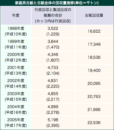 環境省がこのほど発表したところによると、平成17年度(2005年度)の行政回収、集団回収で資源化された資源物の数量が初めて1,000万トンに達した(行政回収には清掃工場に持ち込まれて資源化された数量も含む)。このうち紙類(古紙)は520万トンで全体の52%を占めた。 ところで平成10年度の紙類の資源化量は352万トン、7年間で48%増である。ちなみにこの間の古紙全体の回収量の伸びをみると36...