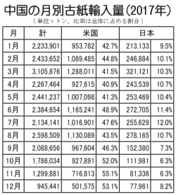 昨年の中国の古紙輸入量は2572万トンで、対前年比9.8%減となった。1面に記載のように、今年は更に500万〜900万トンほどの減少が見込まれている。 昨年の品種別の古紙輸入量は、OCCが10.0%減、上物が3.5%減、ONPが5.9%減、MIXが13.6%減。MIXとOCCの減少率が高い。 国別では、米国が1169万トンで45.5%を占めた。対前年比は8.6%減。次いで英国が302万ト...