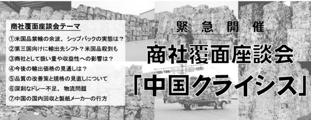 中国が牽引役となって急拡大してきた古紙輸出市場のトレンドが転機を迎えている。中国が発動した輸入規制の強化によって、10年以上続いた「再生資源バブル」が終焉した。買い手市場となった中で、日本品がシップバック処分を受けたり、5月から米国から輸入古紙を実質的に禁輸に動くなど想定外の展開も続く。今後の古紙輸出ビジネスはいったいどうなるのか?5月初旬、これまで古紙輸出を手掛けてきた5名の商社の方々に参集い...