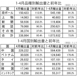4月の古紙輸出量は33万8,864トンで、対前年比95.4%。1ー4月の累計では107万3,932トンで、対前年同期比73.8%となった。昨年8月以降は20万トン台の輸出量が続いていたが、久々に30万トンを超えた。  その要因は、環境規制の強化により減少していた中国向け輸出量が増加したことによる。昨年8月までは、中国向けに月20~30万トン台の輸出が続いていたが、昨9月以降は月8万~14万トン...