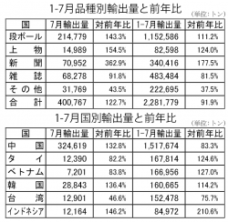 7月の古紙輸出量は40万767トンで、6月に続いて2ヵ月連続で40万トンを超えた。ちなみに昨年は、月ベースでは1度も40万トンを超えていない。一昨年も5月に1度だけなので、今年の6月~7月はかなり輸出量が伸びたと言えるだろう。  これだけ輸出量が伸びた背景には、内外価格差が急速に拡がったことや、問屋・メーカー共に在庫が膨れ、需給調整が進んだことが挙げられる。また中国による米国品の禁輸措置等によ...