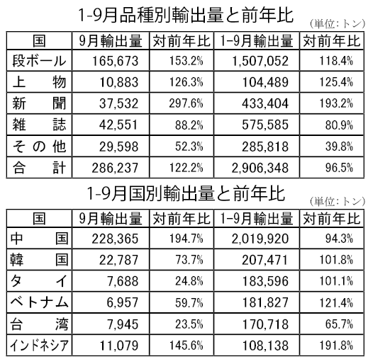 9月の古紙輸出量は28万6,237トンと、5カ月ぶりに30万トンを割った。前月より15%減ったものの、前年同月に比べると22%多い。9月は台風・地震といった自然災害に見舞われたことで、発生の落ち込みや港湾荷役の停滞が影響したとみられる。 品種別にみると、段ボールが16万6,000トン、新聞が3万7,500トンと、前月より2万2,000トン、1万8,000トンずつ減った。とはいえ、この2、3年...