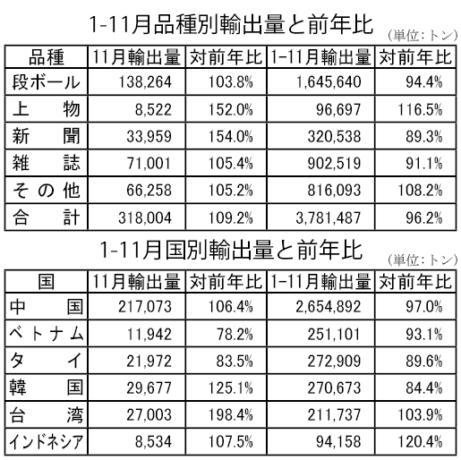 11月の古紙輸出量は31万8,004トンで前月比では1.1%減だったが、対前年同月比では9.2%の増加だった。品種別でみても、全種で前年同月を上回った。特に新聞と上物で、増加率は50%を超えた。 11月は段ボールを中心に輸出価格が急騰したものの、輸出数量に大きな変動はない。日本からの古紙輸出は、価格と量が連動せず、回収量から国内消費量を差し引いた需給ギャップに左右される。 1―11月の累...