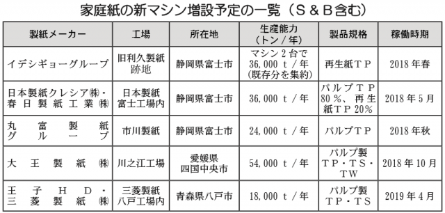 家庭紙の新マシン増設予定の一覧(S&B含む)