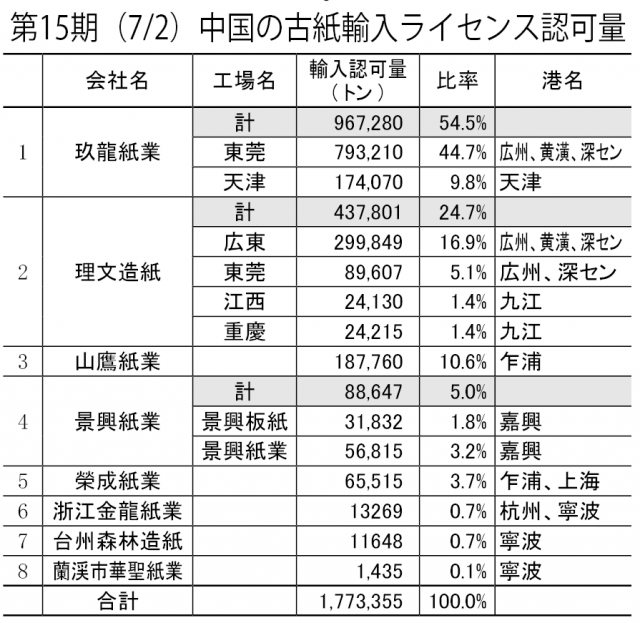 第15期(7/2)中国の古紙輸入ライセンス認可量