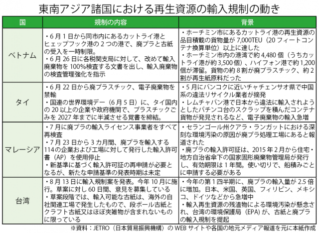 中国の輸入規制に追随する動きが東南アジア諸国でも広がりつつある。行き場を失った古紙や廃プラなどの再生資源が殺到し、港湾混雑や環境汚染に対する懸念が広がっているためだ。 今年に入り、東南アジアの各国では廃プラ輸入量が200~300%増加。古紙についても今年の輸入通関統計データを取得してみたところ(下グラフ参照)、もっとも伸び率が大きかったのはインドネシア。1―3月で90%増え、数量にして90万...