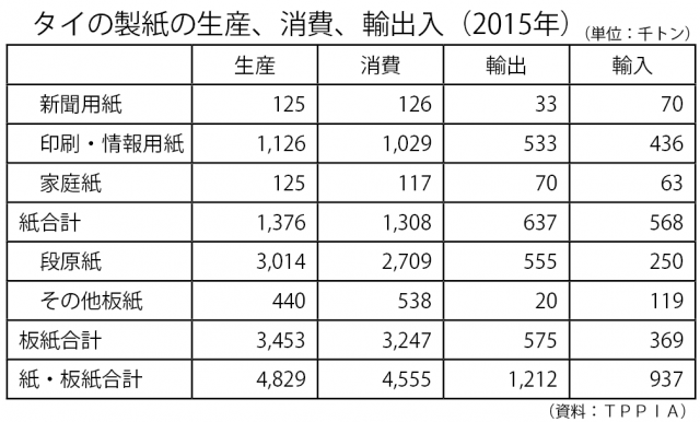 タイの製紙の生産、消費、輸出入(2015年)
