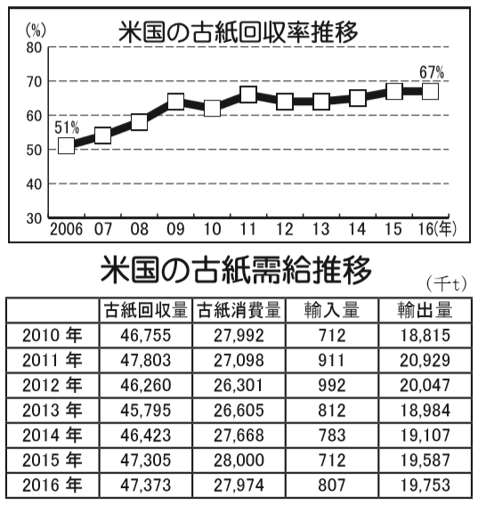 近年は米国の古紙回収率が上昇しており、2016年は67%。米国は2020年の古紙回収率目標を70%に設定している。 米国の家庭系の古紙回収のおよそ8割はシングルストリーム(資源物混載回収)で、回収された資源物は、全米各地にあるMRFと呼ばれる資源化施設で選別される。その選別施設の労働環境は劣悪であり、そこで選別される資源物は、お世辞にも綺麗とは言えない。特に古紙は液体や匂いを吸収しやすいこと...