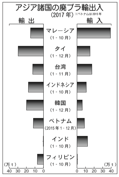 ここでは、アジア各国の廃プラの輸出入の現状を取り上げたい。古紙市場との大きな違いはアジア各国が廃プラの輸入国であるだけでなく、中国・香港向けに大量の廃プラが輸出されてきたことである。ASEANの廃プラ貿易量の多い5カ国と韓国、台湾、インドの計8カ国を取り上げた。なお、2017年の統計データであるが、年次途中の国も多く、ベトナムのように公表が遅い国もある。 前述のように、インド、フィリピンを除...
