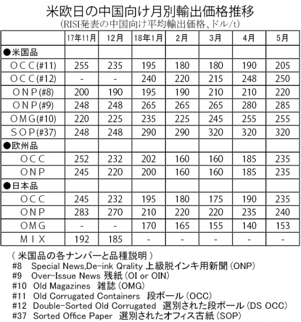 中国政府が発表した5月4日から1ヵ月間の米国品禁輸措置の影響により、各国品ともに中国向け輸出価格が急上昇している。また5月22日、中国税関当局は、米国からの古紙輸出がカナダのCCICを通じて再開される見通しと発表した。欧州では他国のCCIC認証によって中国向けに輸出することができ、今回も暫定的に同じ措置が取られると考えられる。 JーOCCの5月中旬の輸出価格は210ドル、円価でキロ20円台が...