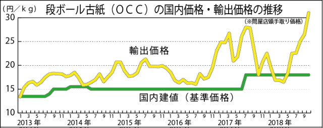 段ボール古紙(OCC)の国内価格・輸出価格の推移