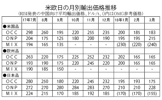 中国向け輸出価格がやや上昇した。春節明けも価格が軟化していたが、先週からOCC(段ボール古紙)とONP(新聞古紙)が反騰した。米OCCは、3月初旬は170〜180ドルだったが、中旬には175〜190ドルとなった。2カ月ぶりに200ドルの大台に戻すか注目される。また米ONPは、3月初旬は200ドルだったが、中旬には210〜220ドルに上昇した。米OMGは3月初旬・中旬ともに240ドルと変化なし。米...