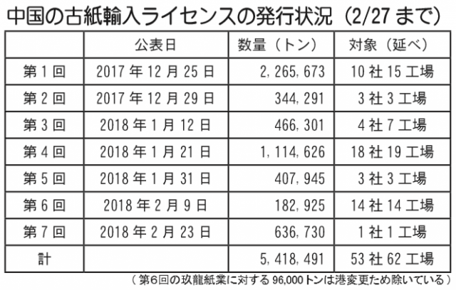 中国の古紙輸入ライセンスの発行状況(2/27まで)